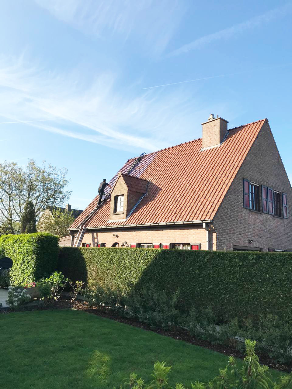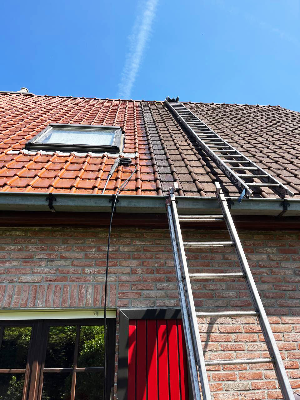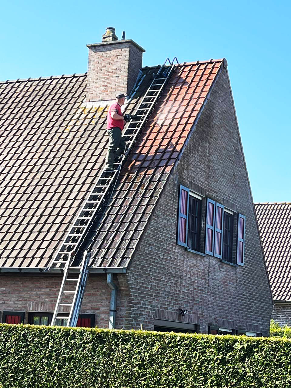 - Technische controle van de dakpannen We begonnen met een visuele en structurele inspectie van het dak om zeker te zijn dat de bestaande pannen geschikt waren voor reiniging en nabehandeling. Hierbij werd gecontroleerd op schade, losliggende elementen en mosvorming.